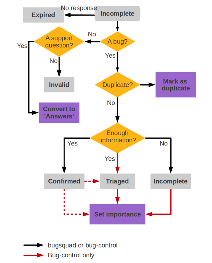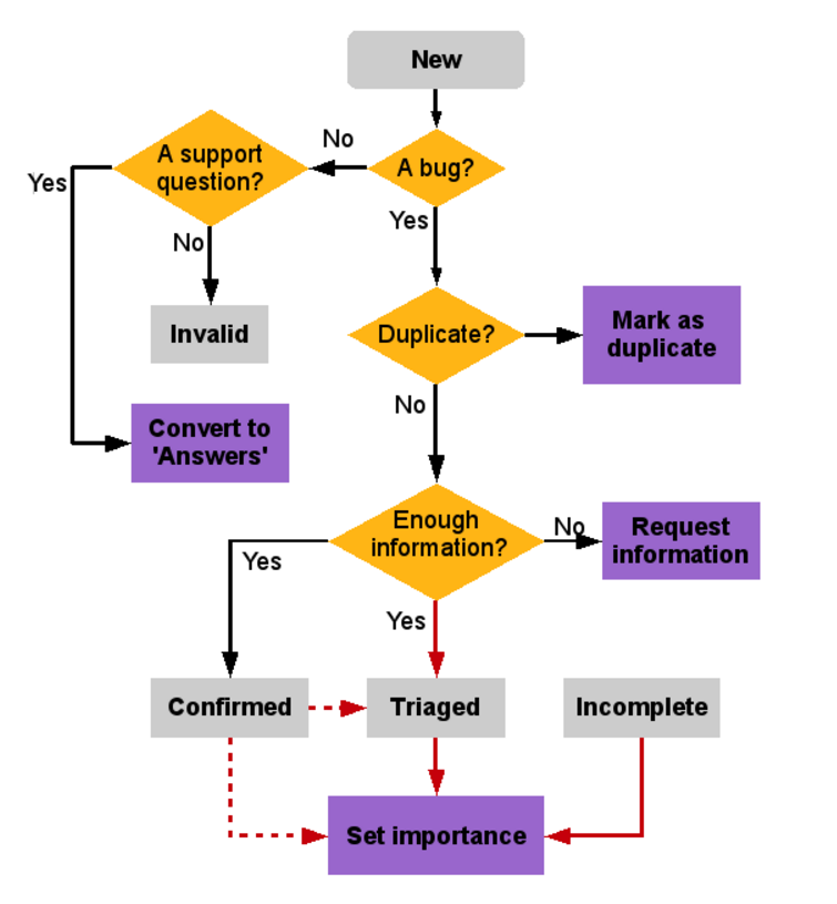 Ubuntu每天都會經由『bug tracking system』收到很多的Bug回報,每一個上面的bug都需要被讀取,評估並且分類排序,這樣它們才能被工程師修復,這部份的話就是我們可以幫忙的地方,擷取官方的流程圖,清楚的狀態轉換流程描述如下: